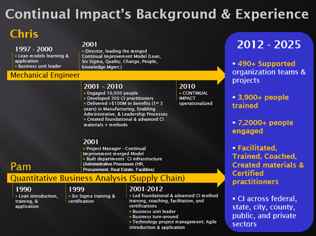 The team of Continual Impact has spent the majority of their careers learning, applying, teaching, and integrating continuous improvement principles and methods to help create high performance people and teams.