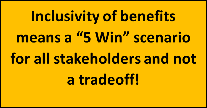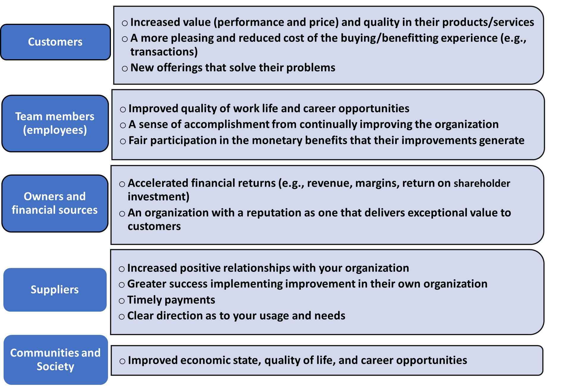 Different models of improvement place different emphasis on WHO are the recipients of the benefits and WHAT are those benefits. [1]. The benefits provided by continual improvement need to be real and inclusive of all stakeholders. Stakeholders = a person or group of people who affects or is affected by a change. Stakeholders and benefits include: