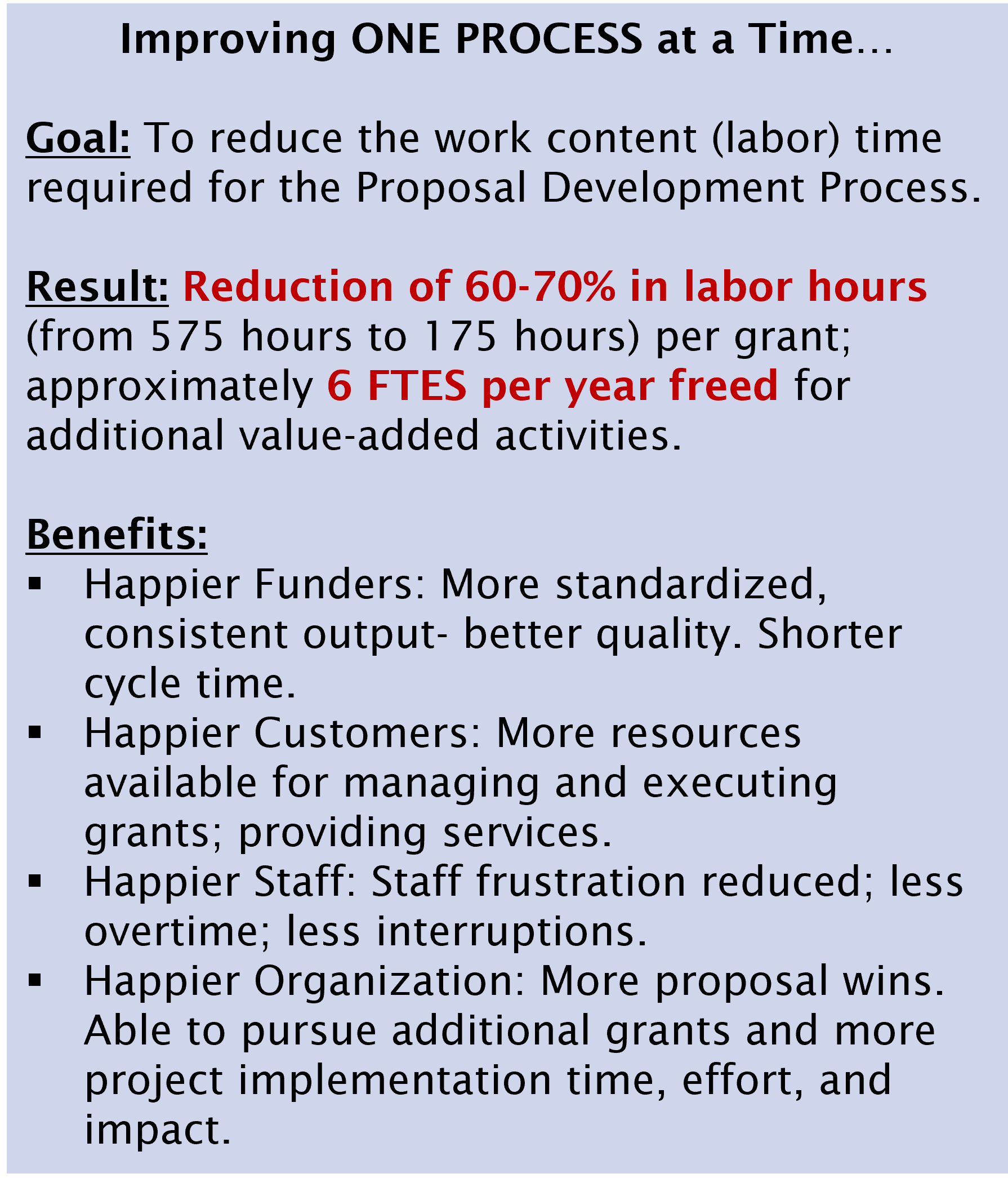 The impact of such an approach can be stunning. Organization effectiveness and efficiency can be increased at a rate greater than historical norms and perhaps greater than thought possible. Outcomes for customers can be improved. Costs can be improved that allow for more customers to be served with the same number of staff. Time can also be freed up to pursue other value-added activities.