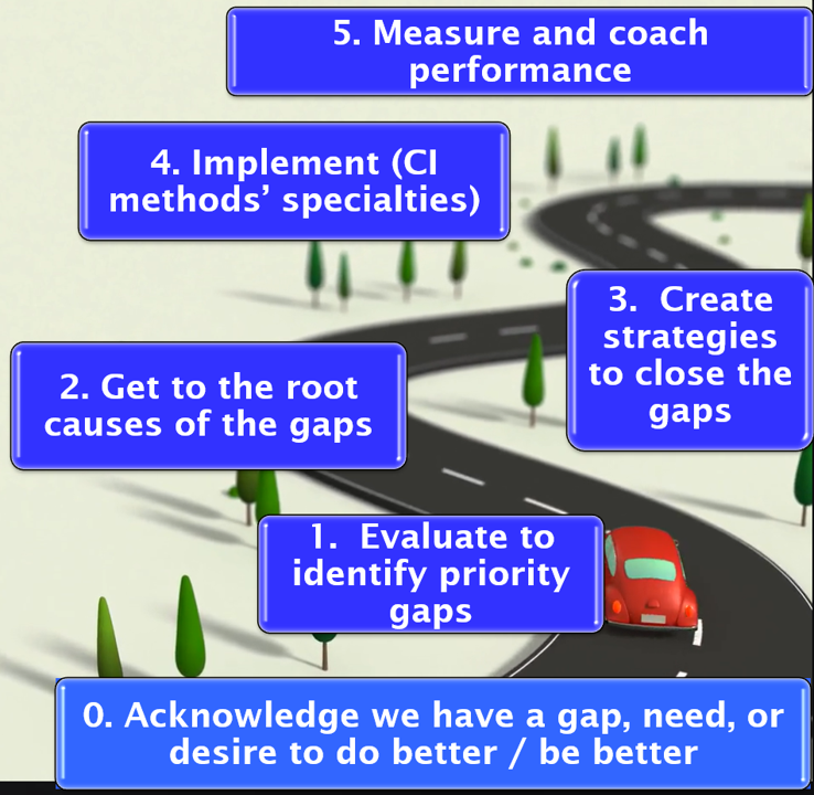 - With speed bumps in Steps 0-1-2-3 resolved 4. Implementation will have less obstacles and more support and resources. Additionally, continual improvement and change methods are the sweet treats and caffeine boosters along the journey because they help solve problems/close gaps faster, easier, and better results.